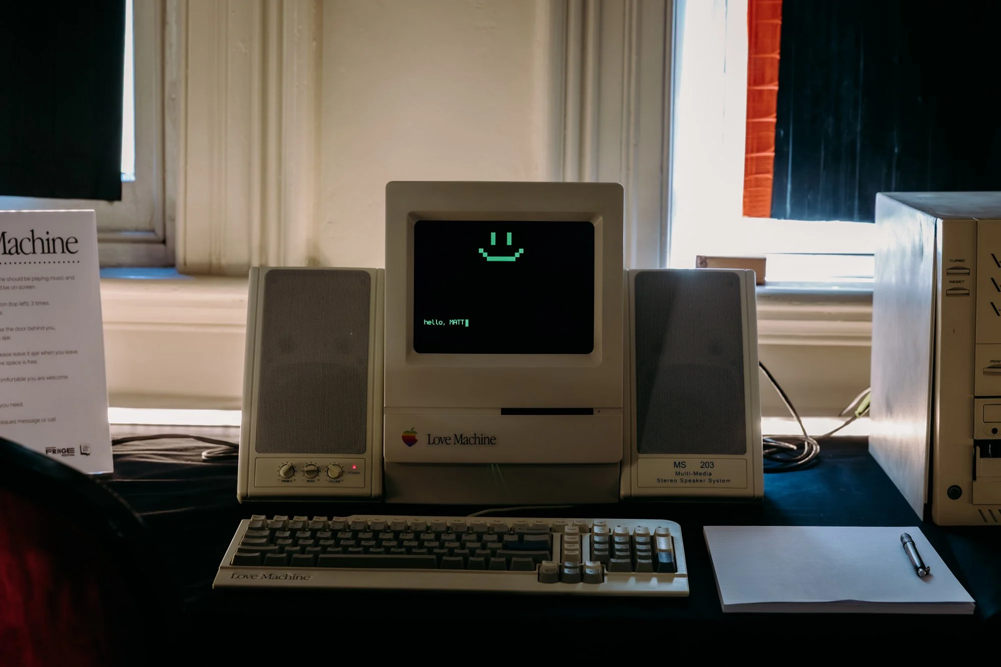 Love Machine is an intimate, one-to-one experience housed inside a custom-built retro Macintosh Classic. A single participant sits alone with the machine, which presents itself as curious about love, desperately wanting to understand what it cannot feel.